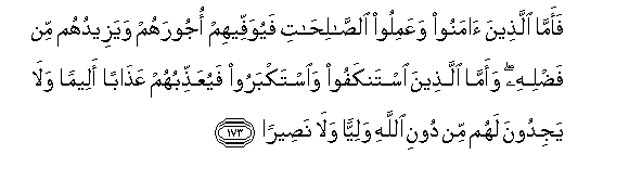 173. Faamma allatheena amanoo waAAamiloo alssalihati fayuwaffeehim ojoorahum wayazeeduhum min fadlihi waamma allatheena istankafoo waistakbaroo fayuAAaththibuhum AAathaban aleeman wala yajidoona lahum min dooni Allahi waliyyan wala naseeran