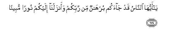 174. Ya ayyuha alnnasu qad jaakum burhanun min rabbikum waanzalna ilaykum nooran mubeenan