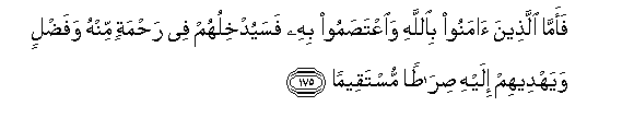 175. Faamma allatheena amanoo biAllahi waiAAtasamoo bihi fasayudkhiluhum fee rahmatin minhu wafadlin wayahdeehim ilayhi siratan mustaqeeman
