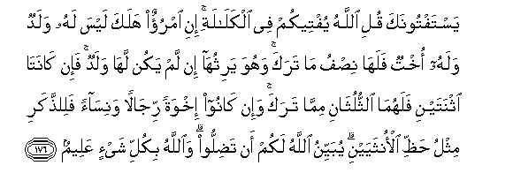 176. Yastaftoonaka quli Allahu yufteekum fee alkalalati ini imruon halaka laysa lahu waladun walahu okhtun falaha nisfu ma taraka wahuwa yarithuha in lam yakun laha waladun fa-in kanata ithnatayni falahuma alththuluthani mimma taraka wa-in kanoo ikhwatan rijalan wanisaan falilththakari mithlu haththi alonthayayni yubayyinu Allahu lakum an tadilloo waAllahu bikulli shay-in AAaleemun