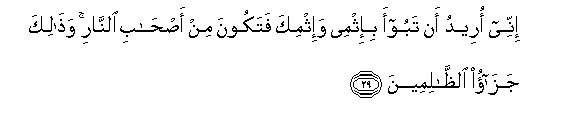 29. "For me, I intend to let thee draw on thyself my sin as well as thine, for thou wilt be among the companions of the fire, and that is the reward of those who do wrong."
