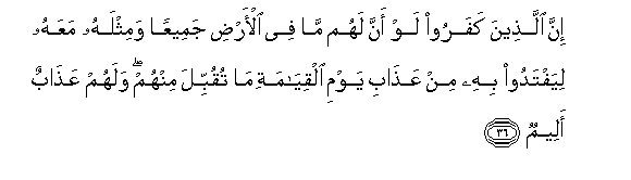 36. Inna allatheena kafaroo law anna lahum ma fee al-ardi jameeAAan wamithlahu maAAahu liyaftadoo bihi min AAathabi yawmi alqiyamati ma tuqubbila minhum walahum AAathabun aleemun