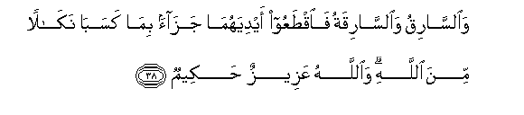 38. As to the thief, Male or female, cut off his or her hands: a punishment by way of example, from God, for their crime: and God is Exalted in power.