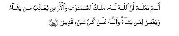 40. Alam taAAlam anna Allaha lahu mulku alssamawati waal-ardi yuAAaththibu man yashao wayaghfiru liman yashao waAllahu AAala kulli shay-in qadeerun