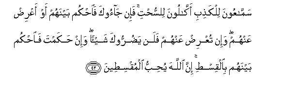 42. SammaAAoona lilkathibi akkaloona lilssuhti fa-in jaooka faohkum baynahum aw aAArid AAanhum wa-in tuAArid AAanhum falan yadurrooka shay-an wa-in hakamta faohkum baynahum bialqisti inna Allaha yuhibbu almuqsiteena
