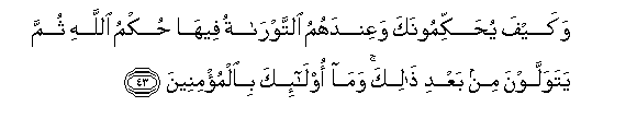 43. Wakayfa yuhakkimoonaka waAAindahumu alttawratu feeha hukmu Allahi thumma yatawallawna min baAAdi thalika wama ola-ika bialmu/mineena
