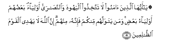 51. Ya ayyuha allatheena amanoo la tattakhithoo alyahooda waalnnasara awliyaa baAAduhum awliyao baAAdin waman yatawallahum minkum fa-innahu minhum inna Allaha la yahdee alqawma alththalimeena