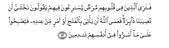 52. Fatara allatheena fee quloobihim maradun yusariAAoona feehim yaqooloona nakhsha an tuseebana da-iratun faAAasa Allahu an ya/tiya bialfathi aw amrin min AAindihi fayusbihoo AAala ma asarroo fee anfusihim nadimeena