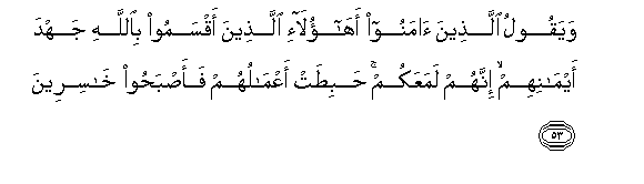53. Wayaqoolu allatheena amanoo ahaola-i allatheena aqsamoo biAllahi jahda aymanihim innahum lamaAAakum habitat aAAmaluhum faasbahoo khasireena