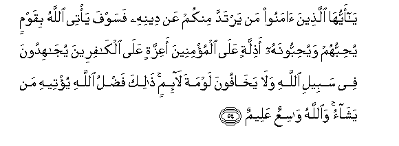 54. Ya ayyuha allatheena amanoo man yartadda minkum AAan deenihi fasawfa ya/tee Allahu biqawmin yuhibbuhum wayuhibboonahu athillatin AAala almu/mineena aAAizzatin AAala alkafireena yujahidoona fee sabeeli Allahi wala yakhafoona lawmata la-imin thalika fadlu Allahi yu/teehi man yashao waAllahu wasiAAun AAaleemun