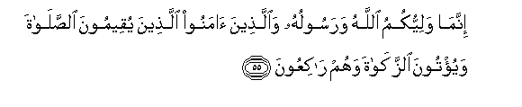 55. Innama waliyyukumu Allahu warasooluhu waallatheena amanoo allatheena yuqeemoona alssalata wayu/toona alzzakata wahum rakiAAoona