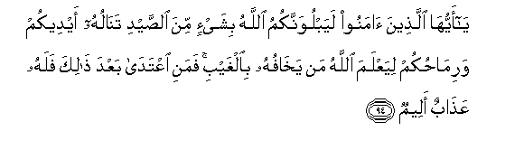 94. Ya ayyuha allatheena amanoo layabluwannakumu Allahu bishay-in mina alssaydi tanaluhu aydeekum warimahukum liyaAAlama Allahu man yakhafuhu bialghaybi famani iAAtada baAAda thalika falahu AAathabun aleemun