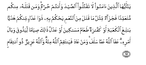 95. Ya ayyuha allatheena amanoo la taqtuloo alssayda waantum hurumun waman qatalahu minkum mutaAAammidan fajazaon mithlu ma qatala mina alnnaAAami yahkumu bihi thawa AAadlin minkum hadyan baligha alkaAAbati aw kaffaratun taAAamu masakeena aw AAadlu thalika siyaman liyathooqa wabala amrihi AAafa Allahu AAamma salafa waman AAada fayantaqimu Allahu minhu waAllahu AAazeezun thoo intiqamin