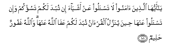 101. Ya ayyuha allatheena amanoo la tas-aloo AAan ashyaa in tubda lakum tasu/kum wa-in tas-aloo AAanha heena yunazzalu alqur-anu tubda lakum AAafa Allahu AAanha waAllahu ghafoorun haleemun