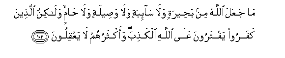 103. Ma jaAAala Allahu min baheeratin wala sa-ibatin wala waseelatin wala hamin walakinna allatheena kafaroo yaftaroona AAala Allahi alkathiba waaktharuhum la yaAAqiloona