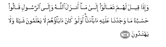 104. Wa-itha qeela lahum taAAalaw ila ma anzala Allahu wa-ila alrrasooli qaloo hasbuna ma wajadna AAalayhi abaana awa law kana abaohum la yaAAlamoona shay-an wala yahtadoona