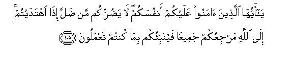 105. Ya ayyuha allatheena amanoo AAalaykum anfusakum la yadurrukum man dalla itha ihtadaytum ila Allahi marjiAAukum jameeAAan fayunabbi-okum bima kuntum taAAmaloona