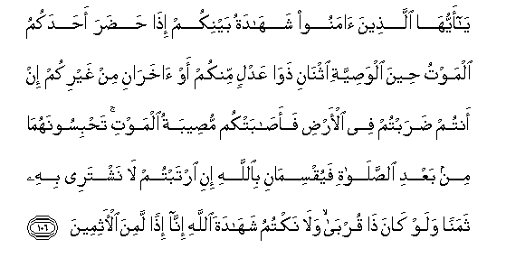 106. Ya ayyuha allatheena amanoo shahadatu baynikum itha hadara ahadakumu almawtu heena alwasiyyati ithnani thawa AAadlin minkum aw akharani min ghayrikum in antum darabtum fee al-ardi faasabatkum museebatu almawti tahbisoonahuma min baAAdi alssalati fayuqsimani biAllahi ini irtabtum la nashtaree bihi thamanan walaw kana tha qurba wala naktumu shahadata Allahi inna ithan lamina al-athimeena