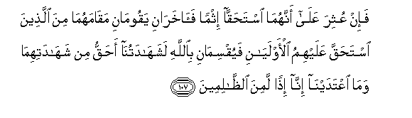 107. Fa-in AAuthira AAala annahuma istahaqqa ithman faakharani yaqoomani maqamahuma mina allatheena istahaqqa AAalayhimu al-awlayani fayuqsimani biAllahi lashahadatuna ahaqqu min shahadatihima wama iAAtadayna inna ithan lamina alththalimeena