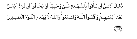 108. Thalika adna an ya/too bialshshahadati AAala wajhiha aw yakhafoo an turadda aymanun baAAda aymanihim waittaqoo Allaha waismaAAoo waAllahu la yahdee alqawma alfasiqeena