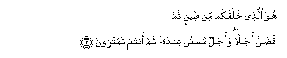 2. Huwa allathee khalaqakum min teenin thumma qada ajalan waajalun musamman AAindahu thumma antum tamtaroona