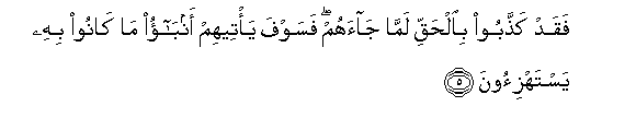 5. Faqad kaththaboo bialhaqqi lamma jaahum fasawfa ya/teehim anbao ma kanoo bihi yastahzi-oona