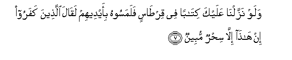 7. Walaw nazzalna AAalayka kitaban fee qirtasin falamasoohu bi-aydeehim laqala allatheena kafaroo in hatha illa sihrun mubeenun