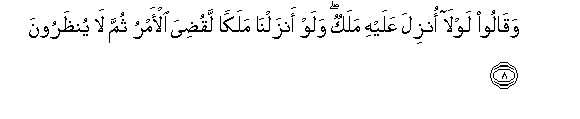 8. Waqaloo lawla onzila AAalayhi malakun walaw anzalna malakan laqudiya al-amru thumma la yuntharoona