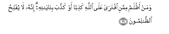 21. Waman athlamu mimmani iftara AAala Allahi kathiban aw kaththaba bi-ayatihi innahu la yuflihu alththalimoona