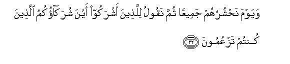 22. Wayawma nahshuruhum jameeAAan thumma naqoolu lillatheena ashrakoo ayna shurakaokumu allatheena kuntum tazAAumoona