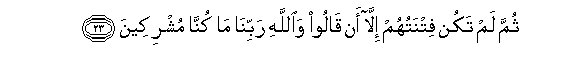 23. Thumma lam takun fitnatuhum illa an qaloo waAllahi rabbina ma kunna mushrikeena