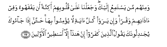25. Waminhum man yastamiAAu ilayka wajaAAalna AAala quloobihim akinnatan an yafqahoohu wafee athanihim waqran wa-in yaraw kulla ayatin la yu/minoo biha hatta itha jaooka yujadiloonaka yaqoolu allatheena kafaroo in hatha illa asateeru al-awwaleena