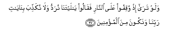 27. Walaw tara ith wuqifoo AAala alnnari faqaloo ya laytana nuraddu wala nukaththiba bi-ayati rabbina wanakoona mina almu/mineena