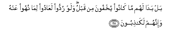 28. Bal bada lahum ma kanoo yukhfoona min qablu walaw ruddoo laAAadoo lima nuhoo AAanhu wa-innahum lakathiboona