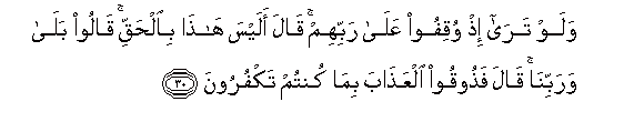30. Walaw tara ith wuqifoo AAala rabbihim qala alaysa hatha bialhaqqi qaloo bala warabbina qala fathooqoo alAAathaba bima kuntum takfuroona