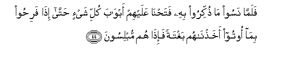 44. Falamma nasoo ma thukkiroo bihi fatahna AAalayhim abwaba kulli shay-in hatta itha farihoo bima ootoo akhathnahum baghtatan fa-itha hum mublisoona
