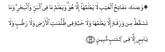 59. WaAAindahu mafatihu alghaybi la yaAAlamuha illa huwa wayaAAlamu ma fee albarri waalbahri wama tasqutu min waraqatin illa yaAAlamuha wala habbatin fee thulumati al-ardi wala ratbin wala yabisin illa fee kitabin mubeenin