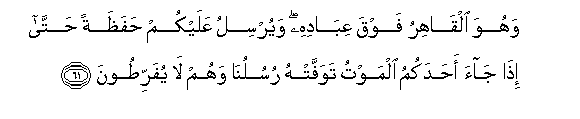 61. Wahuwa alqahiru fawqa AAibadihi wayursilu AAalaykum hafathatan hatta itha jaa ahadakumu almawtu tawaffat-hu rusuluna wahum la yufarritoona