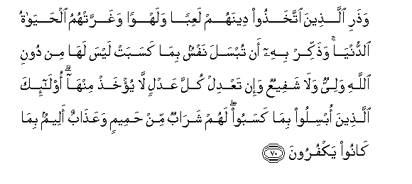 70. Wathari allatheena ittakhathoo deenahum laAAiban walahwan wagharrat-humu alhayatu alddunya wathakkir bihi an tubsala nafsun bima kasabat laysa laha min dooni Allahi waliyyun wala shafeeAAun wa-in taAAdil kulla AAadlin la yu/khath minha ola-ika allatheena obsiloo bima kasaboo lahum sharabun min hameemin waAAathabun aleemun bima kanoo yakfuroona