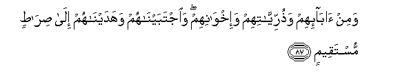 87. Wamin aba-ihim wathurriyyatihim wa-ikhwanihim waijtabaynahum wahadaynahum ila siratin mustaqeemin
