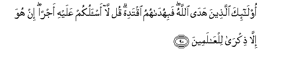 90. Ola-ika allatheena hada Allahu fabihudahumu iqtadih qul la as-alukum AAalayhi ajran in huwa illa thikra lilAAalameena