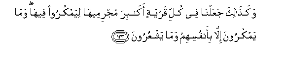 123. Wakathalika jaAAalna fee kulli qaryatin akabira mujrimeeha liyamkuroo feeha wama yamkuroona illa bi-anfusihim wama yashAAuroona