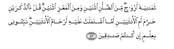 143. (Take) eight (head of cattle) in (four) pairs: of sheep a pair, and of goats a pair; say, hath He forbidden the two males, or the two females, or (the young) which the wombs of the two females enclose? Tell me with knowledge if ye are truthful: