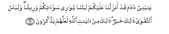 26. Ya banee adama qad anzalna AAalaykum libasan yuwaree saw-atikum wareeshan walibasu alttaqwa thalika khayrun thalika min ayati Allahi laAAallahum yaththakkaroona