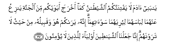 27. Ya banee adama la yaftinannakumu alshshaytanu kama akhraja abawaykum mina aljannati yanziAAu AAanhuma libasahuma liyuriyahuma saw-atihima innahu yarakum huwa waqabeeluhu min haythu la tarawnahum inna jaAAalna alshshayateena awliyaa lillatheena la yu/minoona