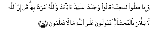 28. Wa-itha faAAaloo fahishatan qaloo wajadna AAalayha abaana waAllahu amarana biha qul inna Allaha la ya/muru bialfahsha-i ataqooloona AAala Allahi ma la taAAlamoona