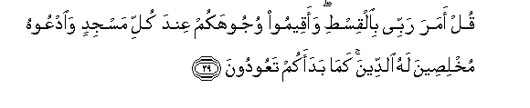 29. Qul amara rabbee bialqisti waaqeemoo wujoohakum AAinda kulli masjidin waodAAoohu mukhliseena lahu alddeena kama badaakum taAAoodoona