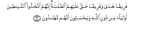 30. Fareeqan hada wafareeqan haqqa AAalayhimu alddalalatu innahumu ittakhathoo alshshayateena awliyaa min dooni Allahi wayahsaboona annahum muhtadoona