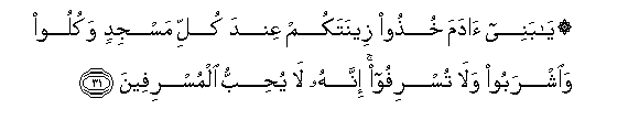 31. Ya banee adama khuthoo zeenatakum AAinda kulli masjidin wakuloo waishraboo wala tusrifoo innahu la yuhibbu almusrifeena
