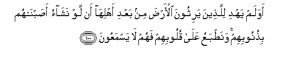 100. Awa lam yahdi lillatheena yarithoona al-arda min baAAdi ahliha an law nashao asabnahum bithunoobihim wanatbaAAu AAala quloobihim fahum la yasmaAAoona